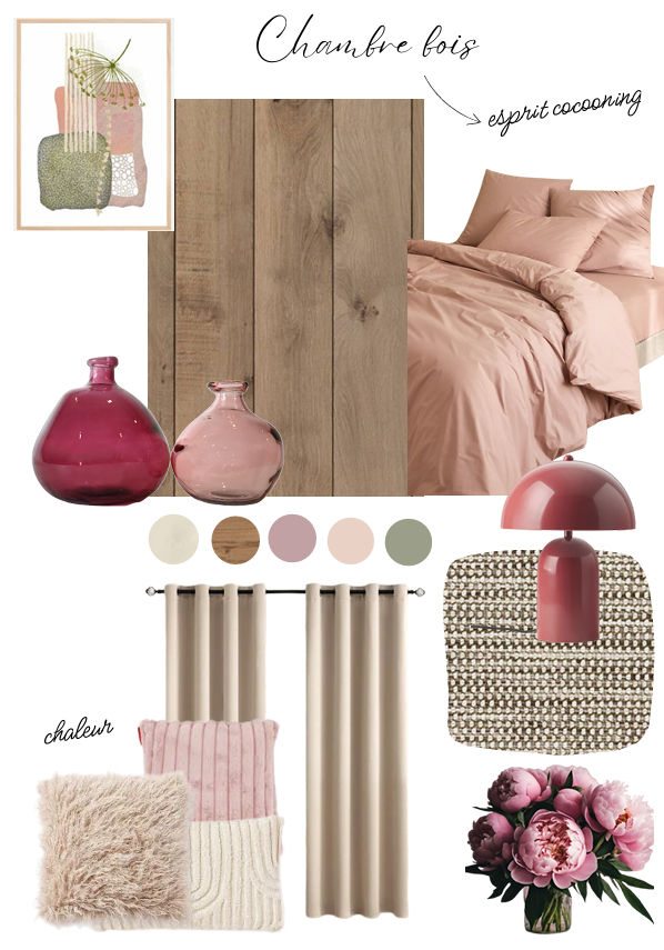 Dans cette prosposition, je propose d'adoucir l'ambiance en privilégiant une teinte rose poudrée pour les éléments du mobilier et accessoires de décoration.