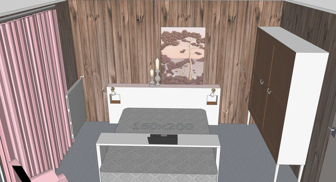 Enfin, je rajoute une tête de lit avec liseuses intégrées et un banc de lit sur roulette.